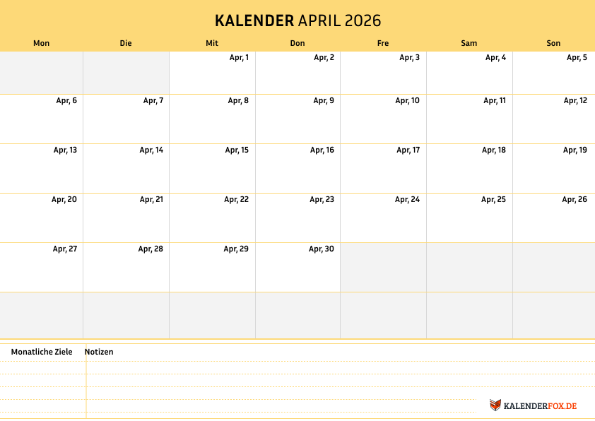 Laden Sie diesen einfachen April 2026 Kalender herunter, der mit einem sanften Gelbton gestaltet ist und fünf Linien enthält, um Ihnen beim Hinzufügen Ihrer Notizen zu helfen.