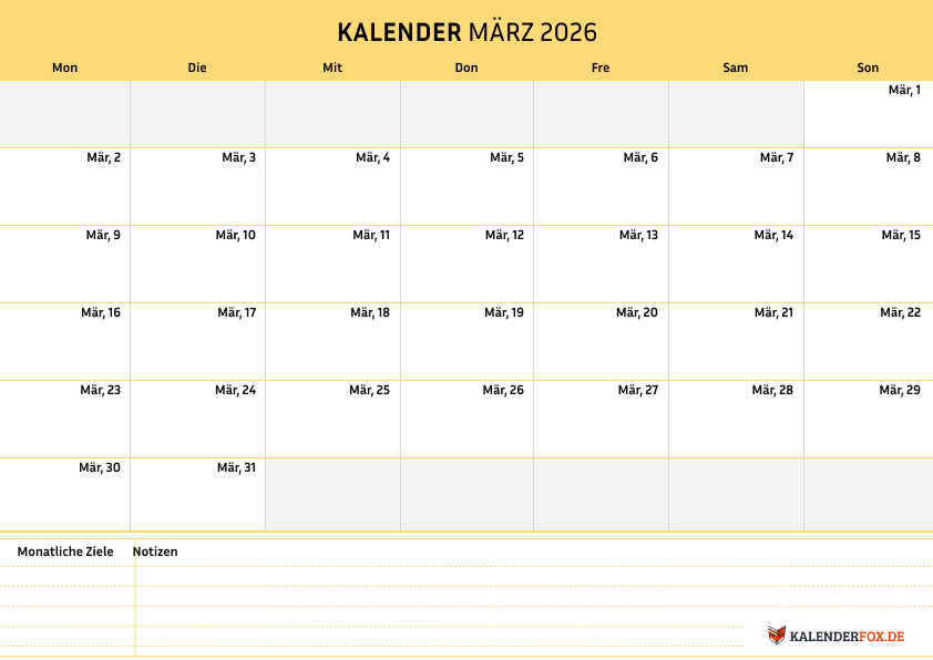 Laden Sie diesen einfachen Marz 2026 Kalender herunter, der mit einem sanften Gelbton gestaltet ist und fünf Linien enthält, um Ihnen beim Hinzufügen Ihrer Notizen zu helfen.