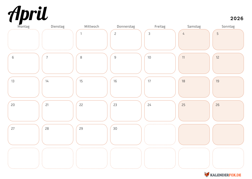 Laden Sie diesen eleganten April 2026 Kalender in sanftem Beigeton mit abgerundeten Datumsfeldern herunter.
