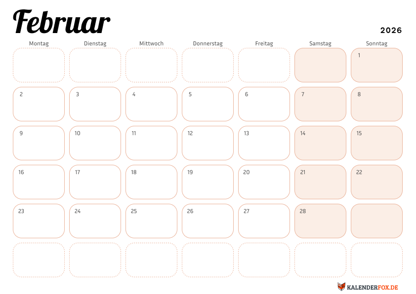 Laden Sie diesen eleganten Februar 2026 Kalender in sanftem Beigeton mit abgerundeten Datumsfeldern herunter.