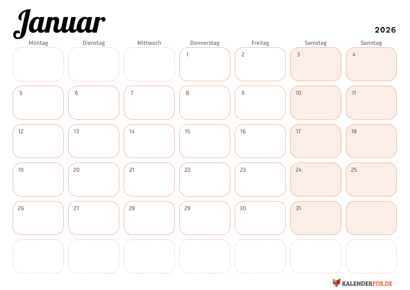 Laden Sie diesen eleganten Januar 2026 Kalender in sanftem Beigeton mit abgerundeten Datumsfeldern herunter.