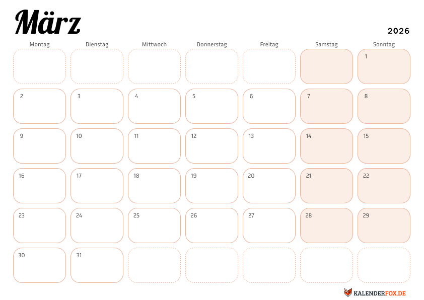Eleganter Kalender 2026 Marz