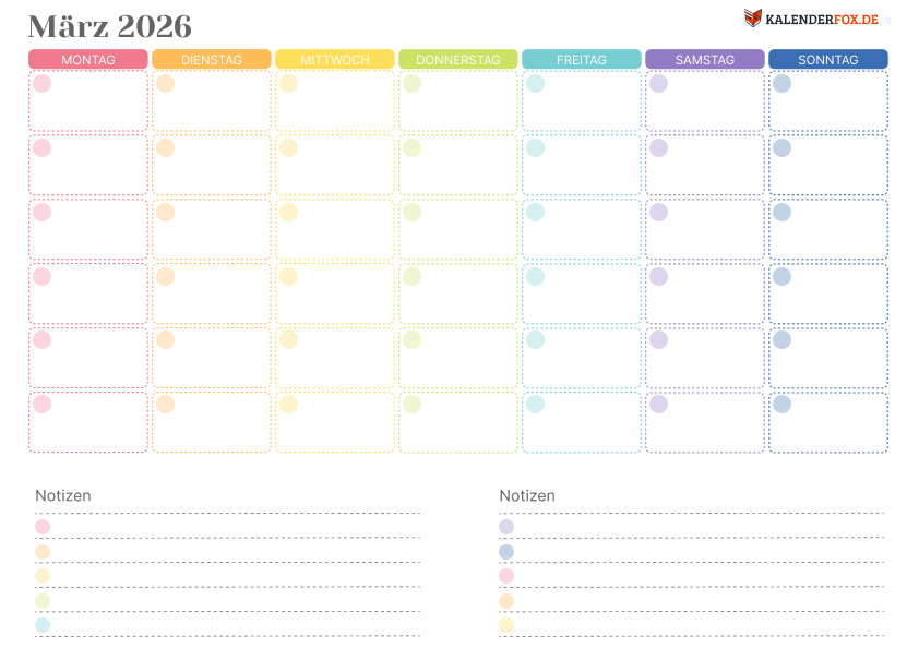 Laden Sie diesen farbenfrohen Marz-Kalender mit 7 sanften Farbpaletten herunter. In jedem Feld befindet sich ein kleiner Kreis für Ihre Checkliste sowie 5 Rasterlinien, um Ihre wichtigsten Prioritäten festzuhalten und Ihre Urlaubsplanung aufzuschreiben. Laden Sie diese fröhliche Vorlage kostenlos im PDF-A4-Querformat herunter.
