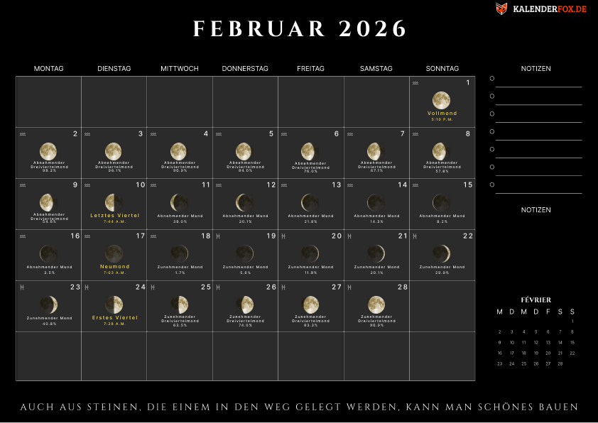 Drucken Sie noch heute unseren Kalender aus, der den Vollmond am Samstag, den 3., das letzte Viertel am Samstag, den 10., den Neumond am Montag, den 19., und das erste Viertel am Montag, den 26., hervorhebt. Wir haben ein schwarzes Design mit einem realistischen gelben Mondbild als Hintergrund gewählt.
