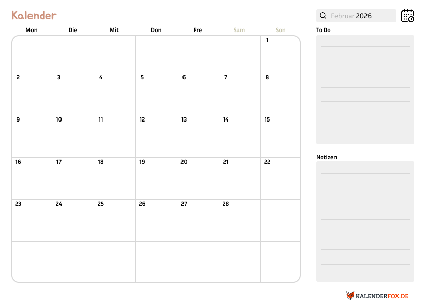 Kalender 2026 Februar mit Notizen