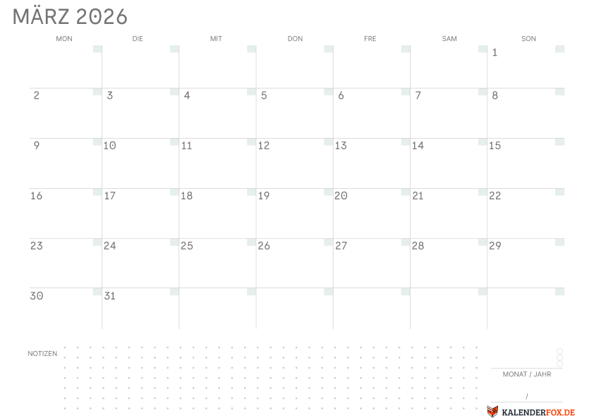 Wenn Sie einen leerer Marz-Kalender suchen, der mehr Platz für Ihre Notizen bietet, laden Sie diese Vorlage im PDF- und PNG-Format herunter.