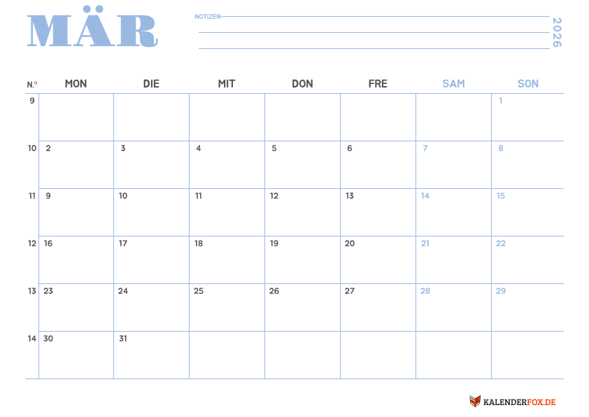 Unser minimalistischer Marz-Kalender hat eine fettgedruckte Monatsüberschrift und ein sanftes Blau, das ihn optisch ansprechend macht. Auf der oberen Vorlage können Sie Ihre Aufgaben oder To-do-Liste notieren.