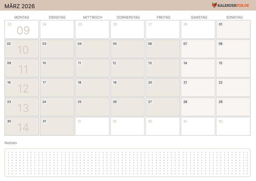 Moderne Kalender 2026 Marz