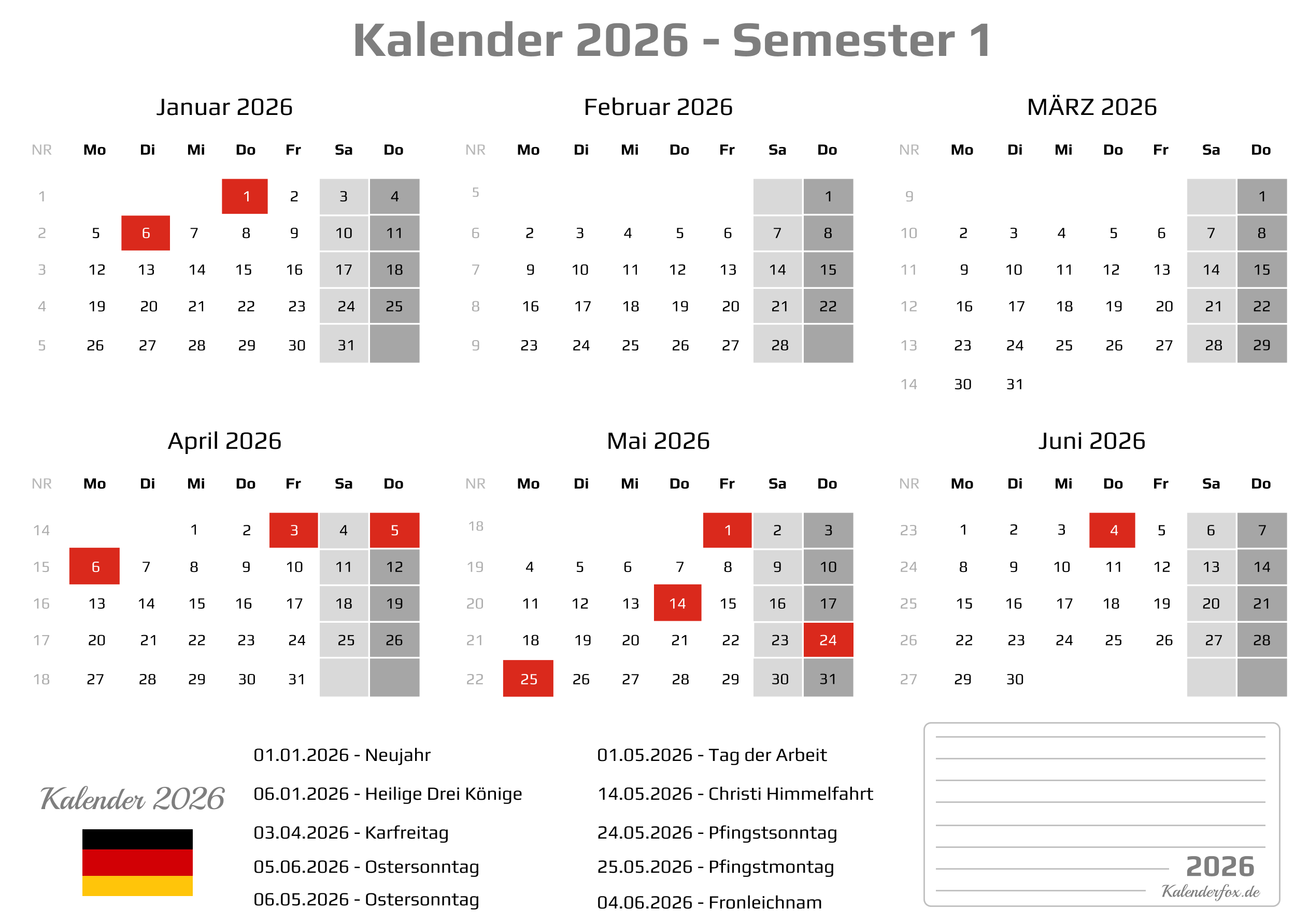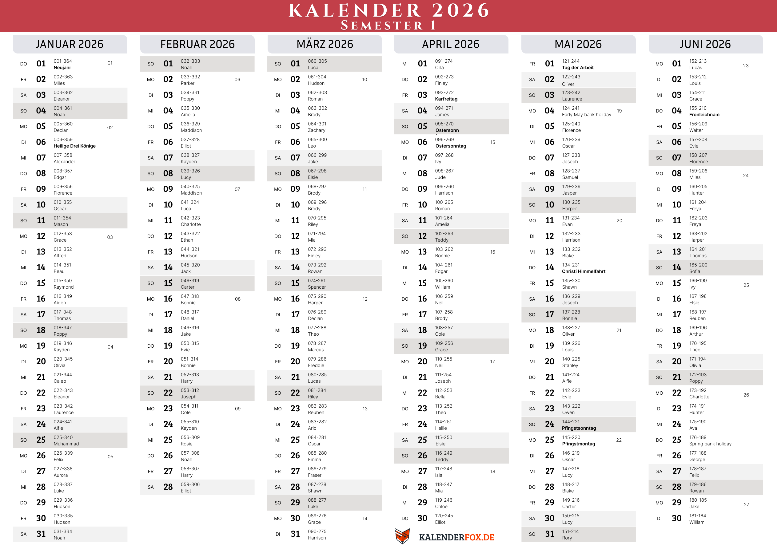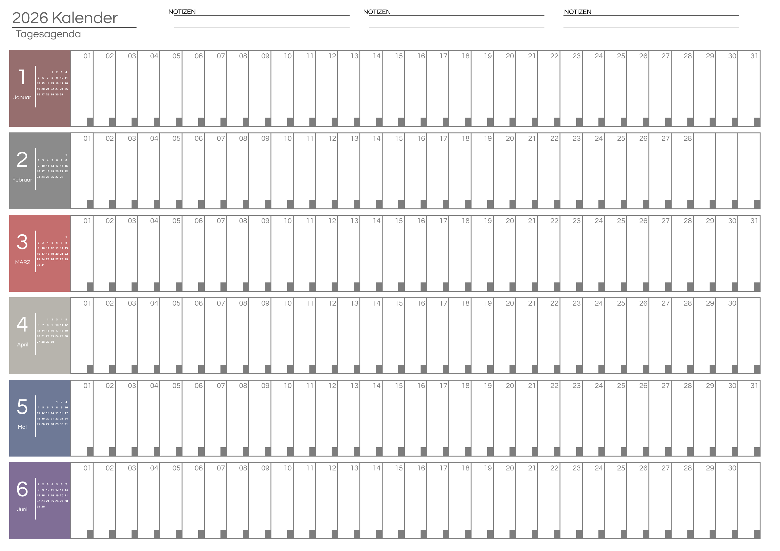 Unsere Kalender für das erste Halbjahr 2026 decken den Zeitraum vom 1. Januar 2026 bis zum 30. Juni 2026 ab. Die Kalender für das zweite Halbjahr 2026 beginnen am 1. Juli 2026 und enden am 31. Dezember 2026. Download und Druck im A4-Querformat – 1 Seite.